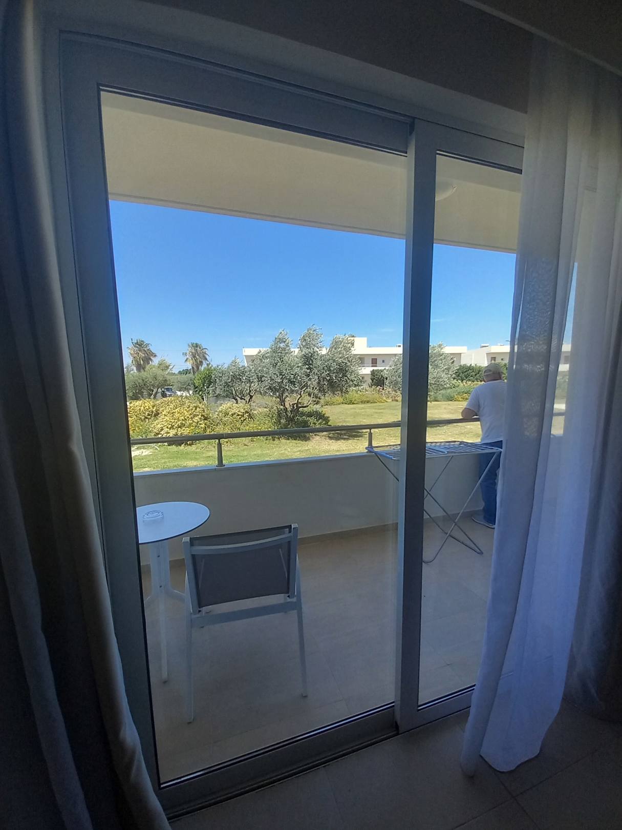 Langer Balkon mit Wäscheständer.
