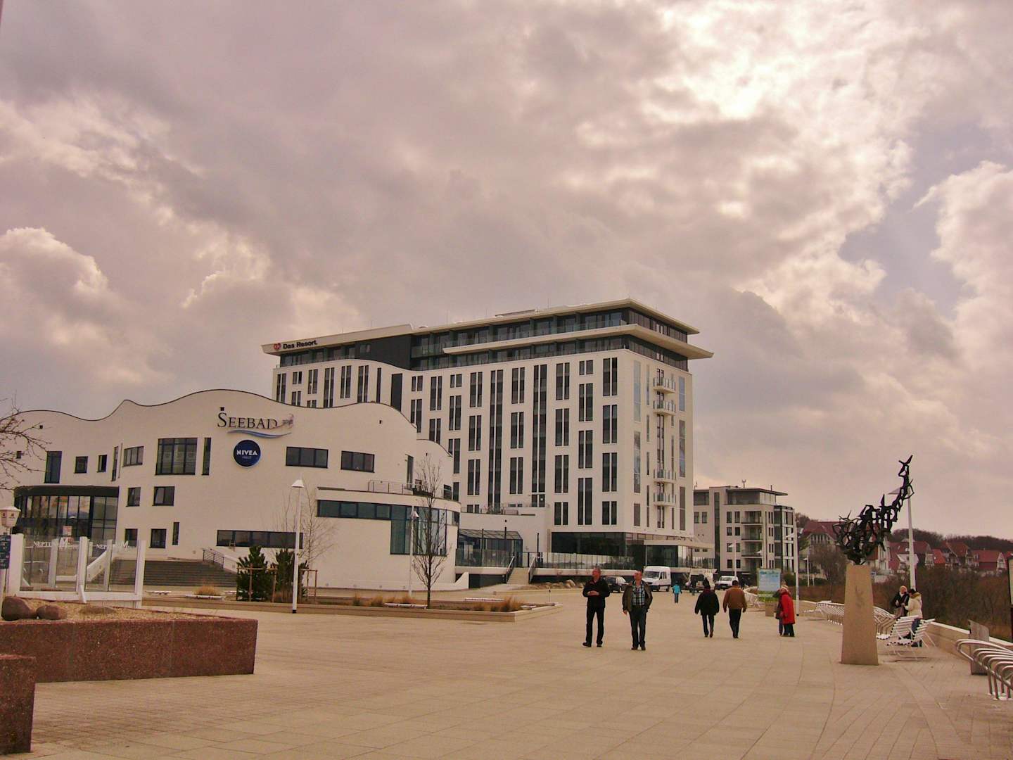 Stand Promenade mit Skulptur im Hintergrund Hotel