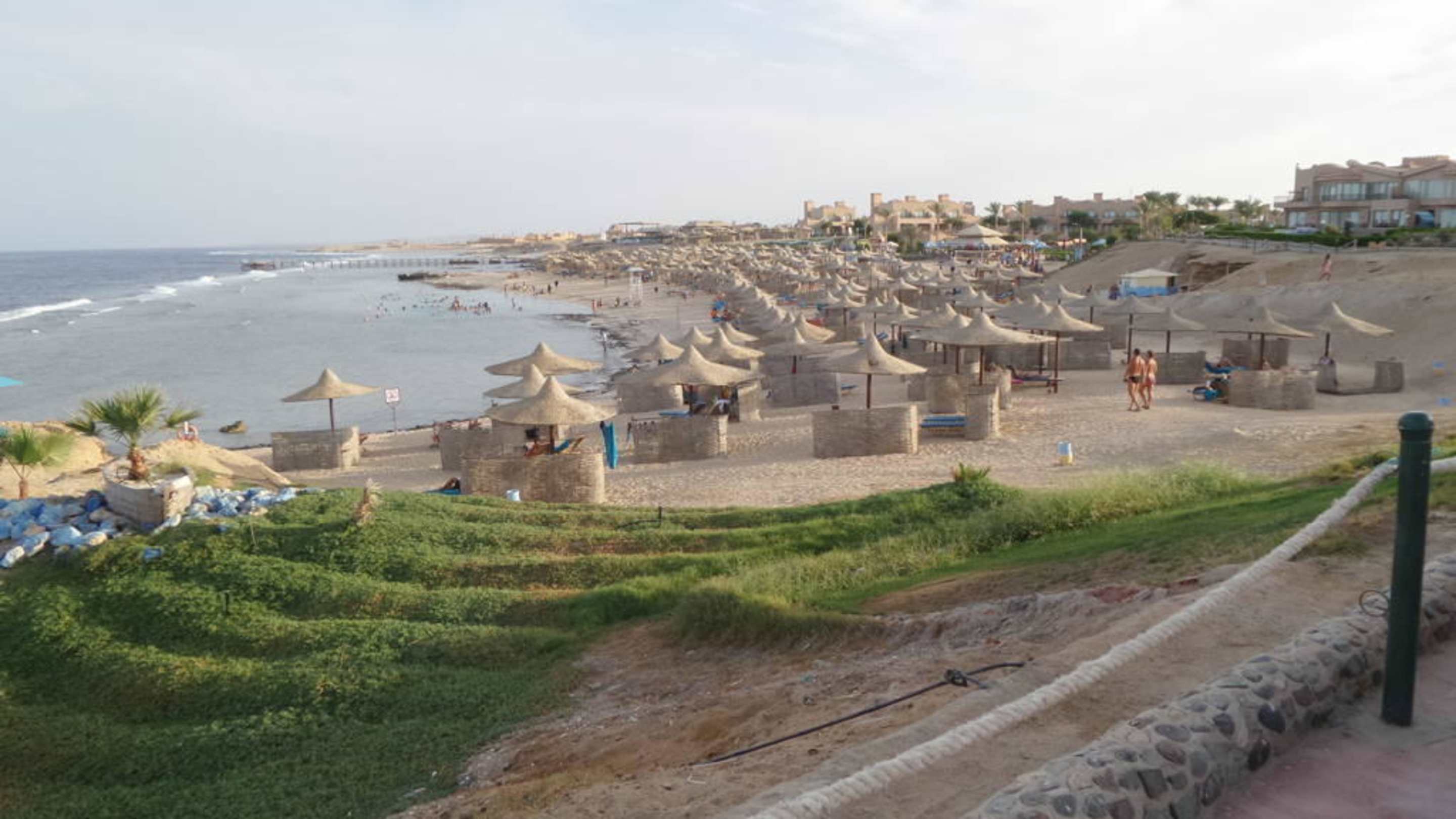Strand und im Hintergrund Riffkante mit Austrittssteg, Mittig der "Pool" im Meer. Aussicht aus der erhöhten Strandbar beim Einstiegssteg.