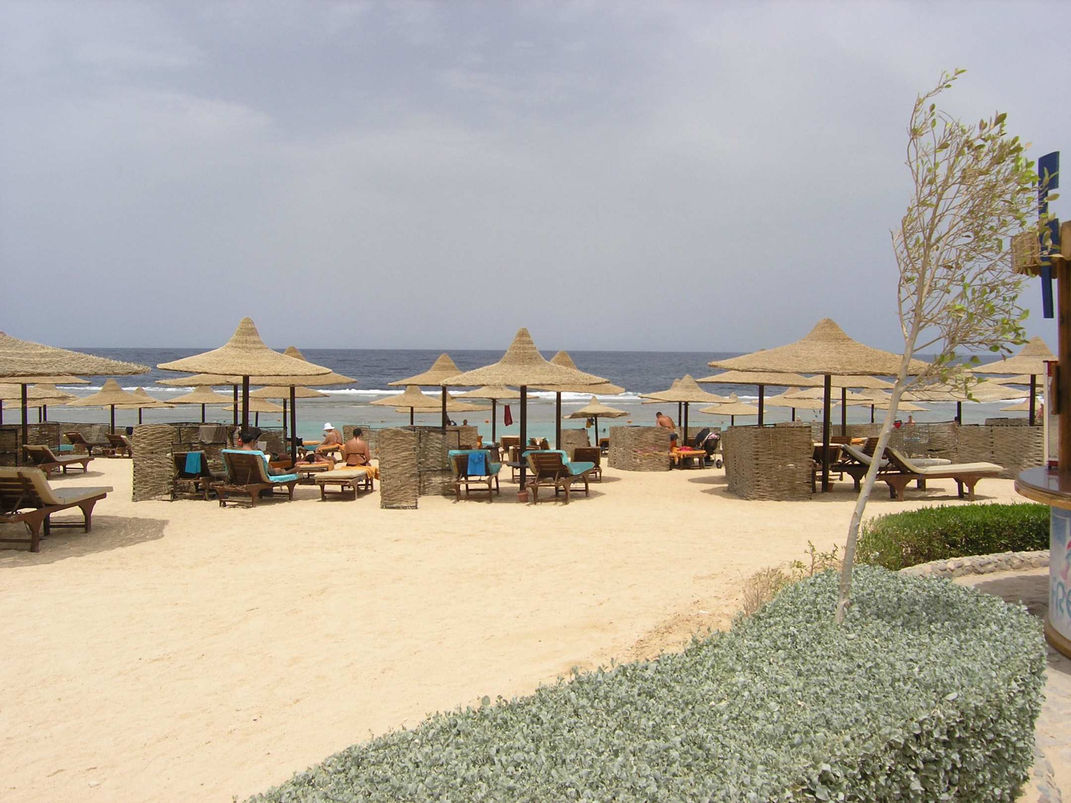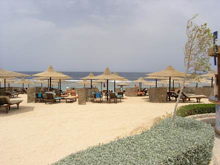 Strandliegen und Sonnenschirme