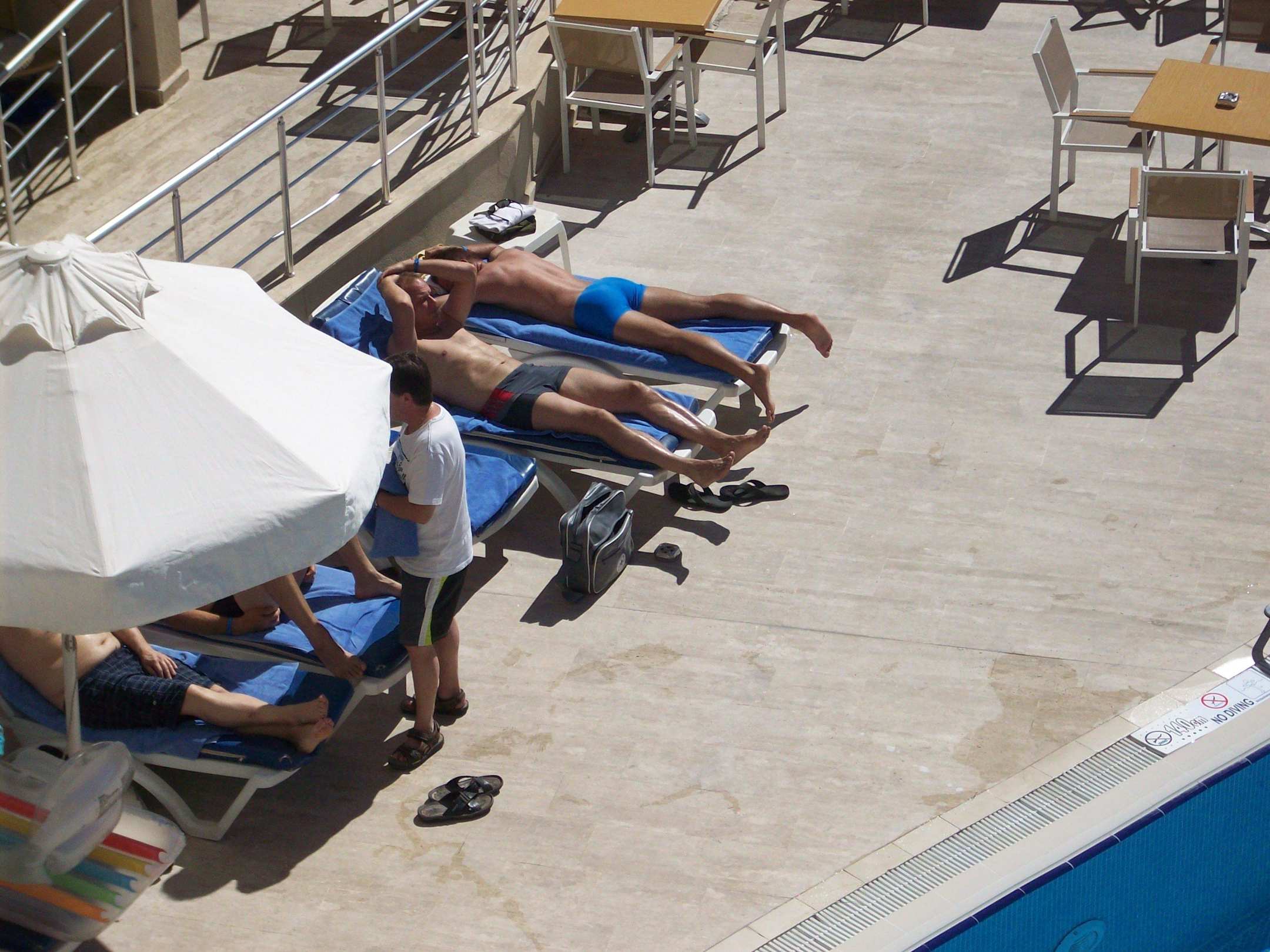 Liegen und Schirme.