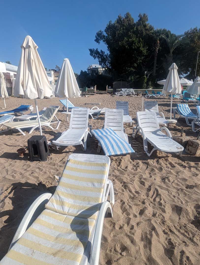 StrandDie Liegen teilweise das Plastik gerissen, und Defekte Sonnenschirme