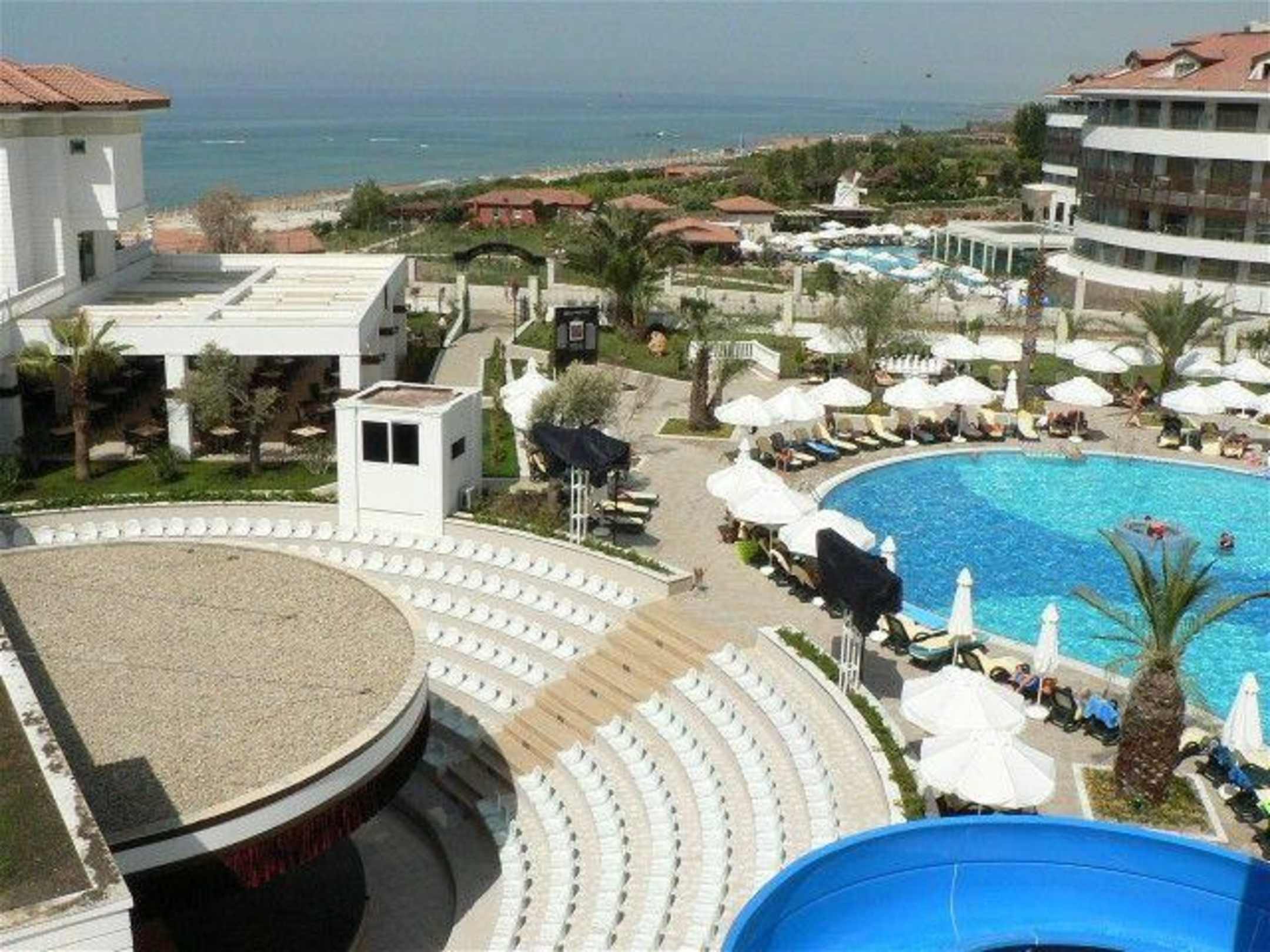 Alba Queen Blickrichtung StrandBild wurde vom Rutschenturm aus aufgenommen. Vorne links ist die Poolbar zu sehen, vorne rechts das Alba Royal. Außerdem sieht man das Tor, durch welches man die Alba Queen-Anlage verlassen muss, wenn man zum Strand gehen möchte.