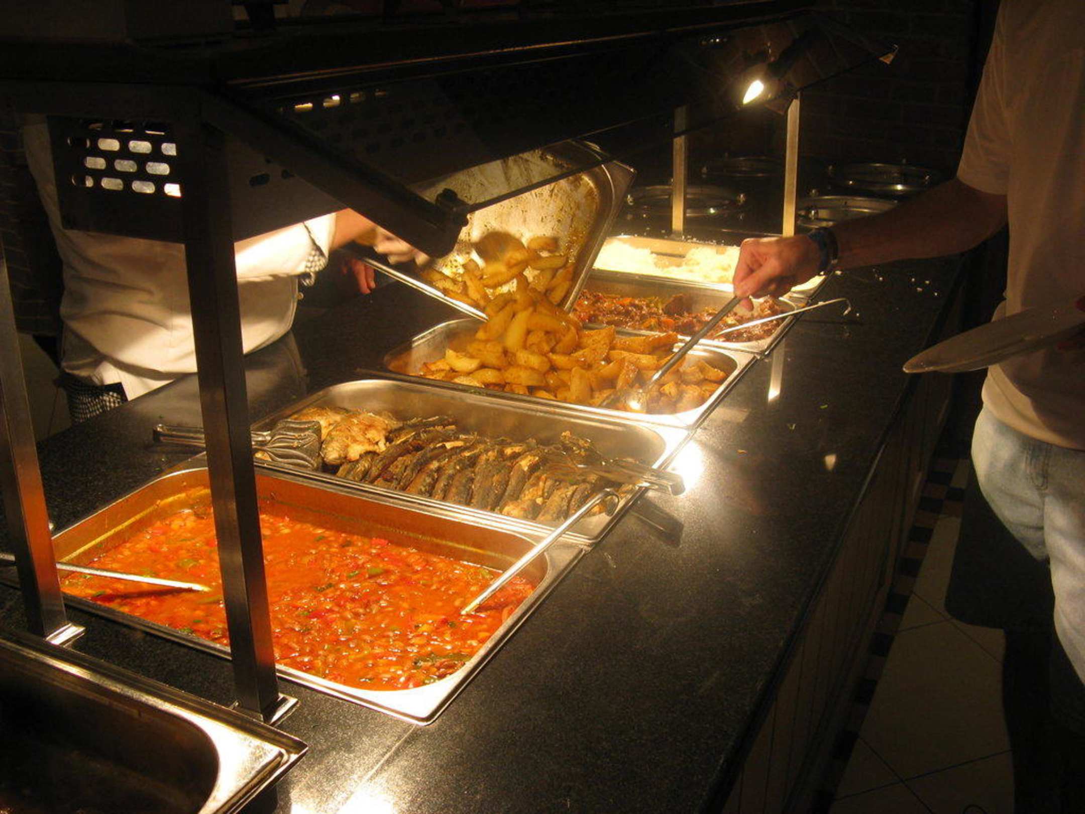 Im Restaurant sind 2 warme Büffets aufgebaut mit Fleisch und Beilagen