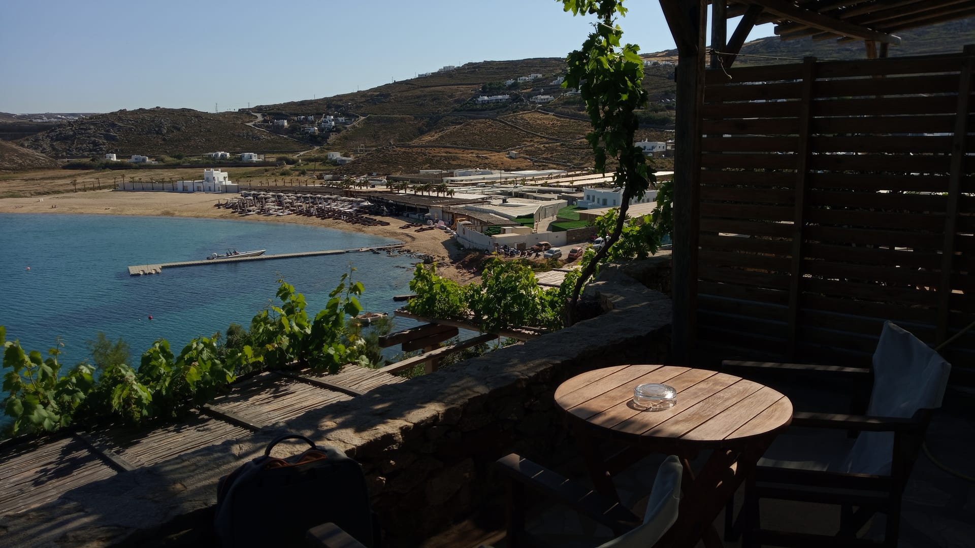 Blick von unserem Balkon Zimmer G2 auf den Panormos Beach und den Beach Club Prinzipote