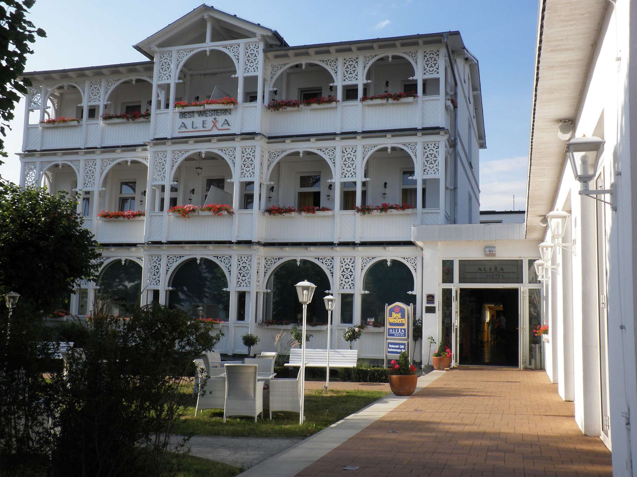 Forderansicht des Hotels mit einem schönen Garten und Sitzmöglichkeiten