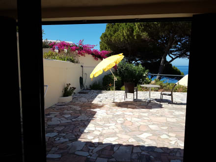 Terasse. Es gibt 2 Liegen mit Auflagen.