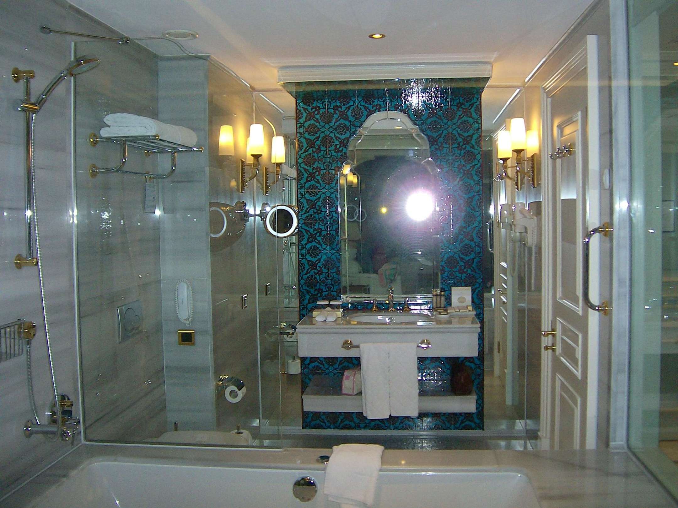 BadezimmerBlick vom Wohnbereich ins Badetimmer welches nur durch eine große Fensterscheibe vom Wohnbereich abgetrennt war.