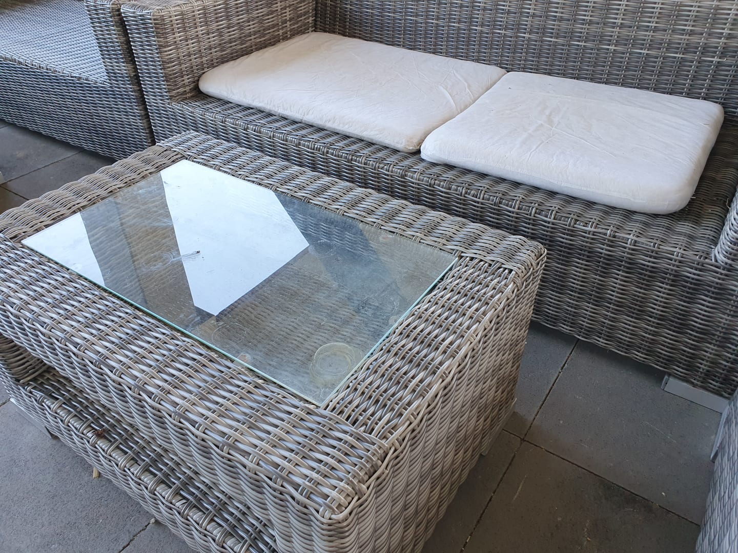 Verdreckte Möbel im Außenbereich und Pölster ohne Bezüge