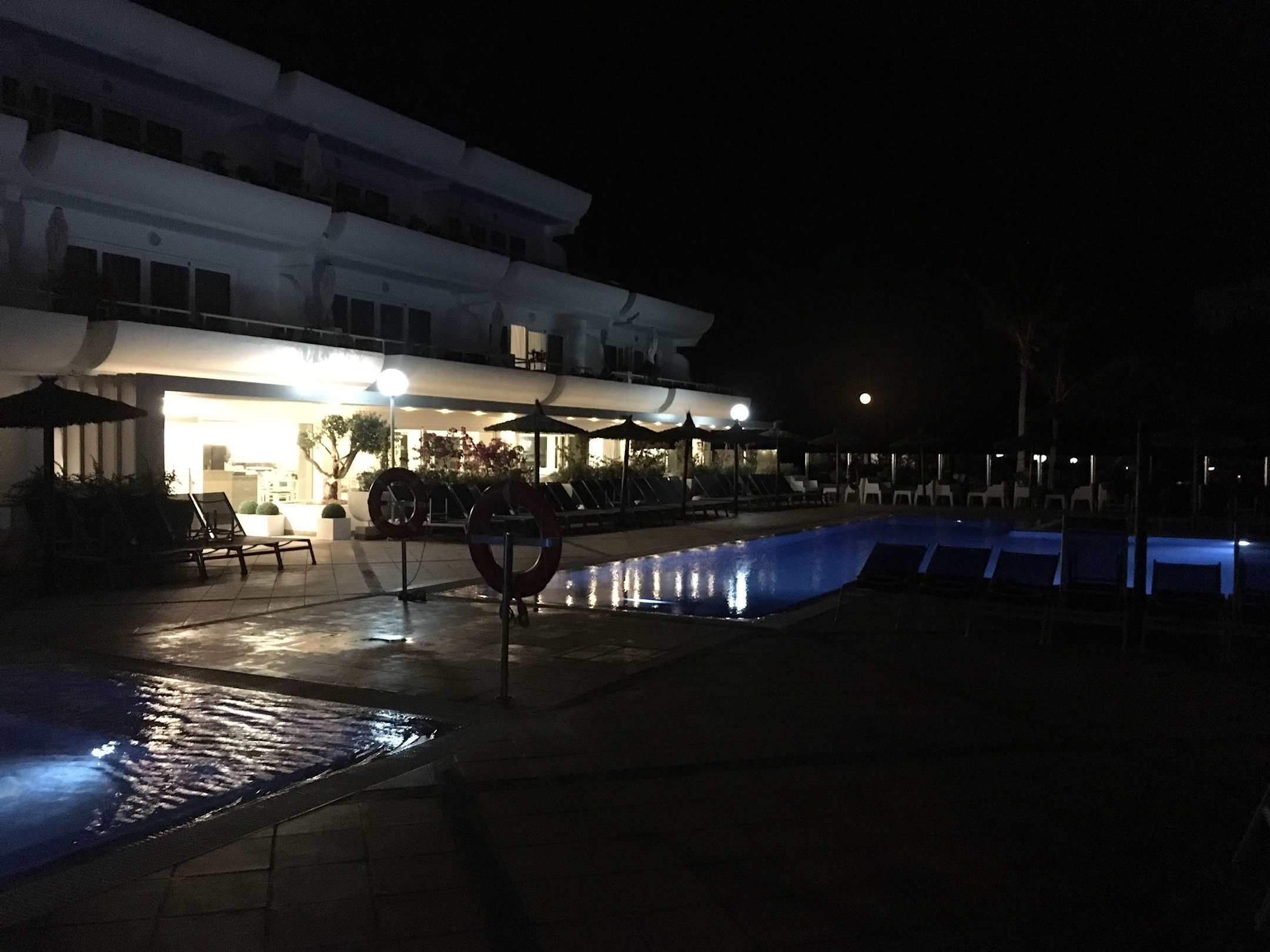 Der beleuchtete Bereich ist der neu gebaute zusätzliche Essbereich. Diese Modernisierung war eine spitzen Idee und sieht super aus. Der rechte Pool ist der Schwimmerberich. Links sieht man einen Teil vom Warmwasserwhirlpool.