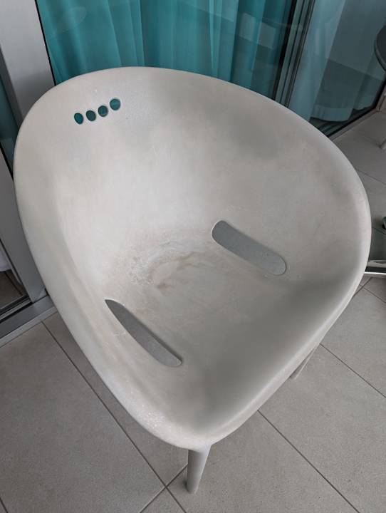 Stuhl auf dem Balkon. Die dunklen Stellen ließen sich mit Wasser und Seife abwaschen. Von wie vielen vorangegangenen Gästen die stammten möchte man lieber nicht wissen (der Geruch war auch entsprechend...)