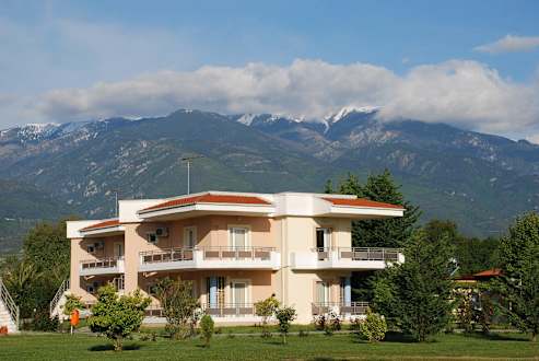 Jeden z budynkow hotelu, w tle Olimp