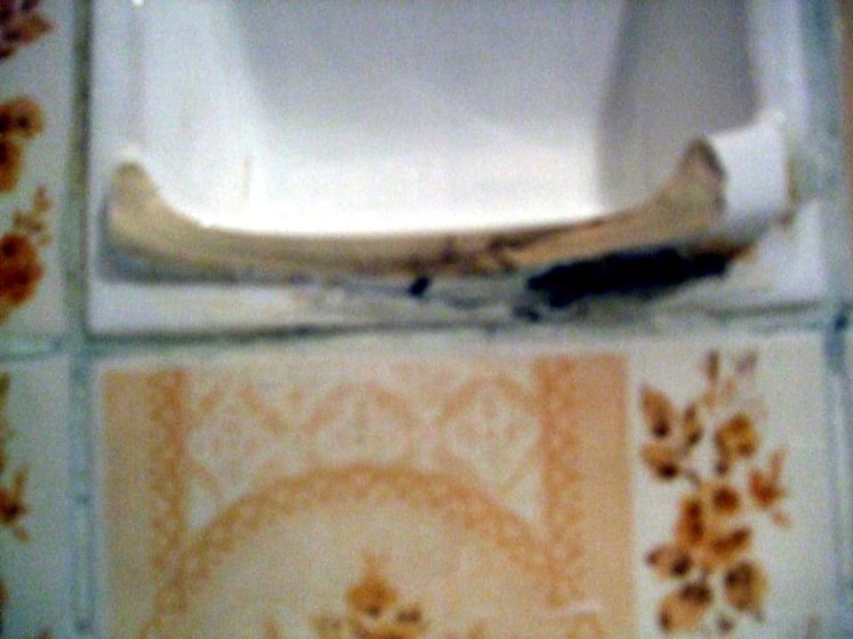 Seifenablagefliesescharfkantige, abgebrochene und wahrscheinlich Schimmelbelegte, Seifenablage, entsprechend älterer Zustand. Zwischen den Fugen ebenfalls, dunkle Schimmelartig, schwarz/graue Ablagerungen.