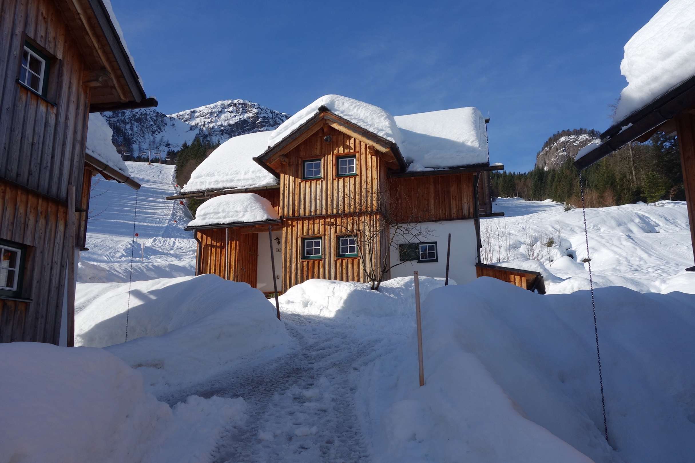 AußenansichtUnsere Hütte liegt direkt an der Piste. :-) Links die Piste, rechts der Kinderhang…..