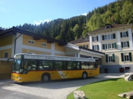 Die Post ist da!Das Postauto holt Gäste gleich an der Türe ab.Toll solches Wetter zum Wandern.