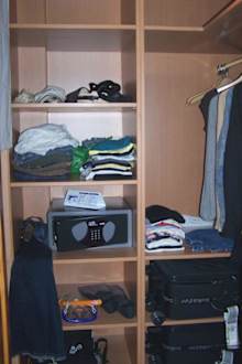 Jedemenge Fächer (auch auf der rechten Seite, nur nicht sichtbar) und Aufhängemöglichkeiten mit Bügeln, sowie ein elektr. Safe