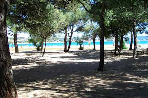 Ein paar Schattenspender zwischen Hotel und Strand Amadria Park Kids Hotel Andrija