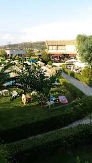 Blick vom BalkonTeil der Gartenanlage mit Haupthaus im Hintergrund und links etwas Pool zu sehen. Der gepflasterte Weg ist der Weg zu den Zimmern