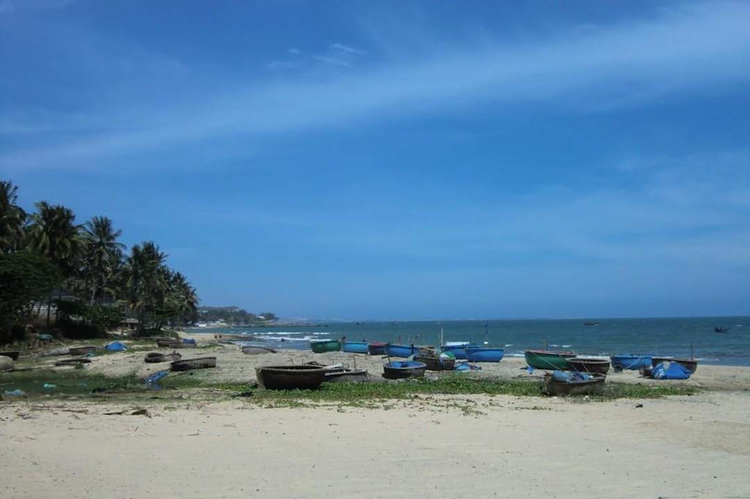 Blick vom Hotelstrand nach links zu den typischen runden Fischerbooten