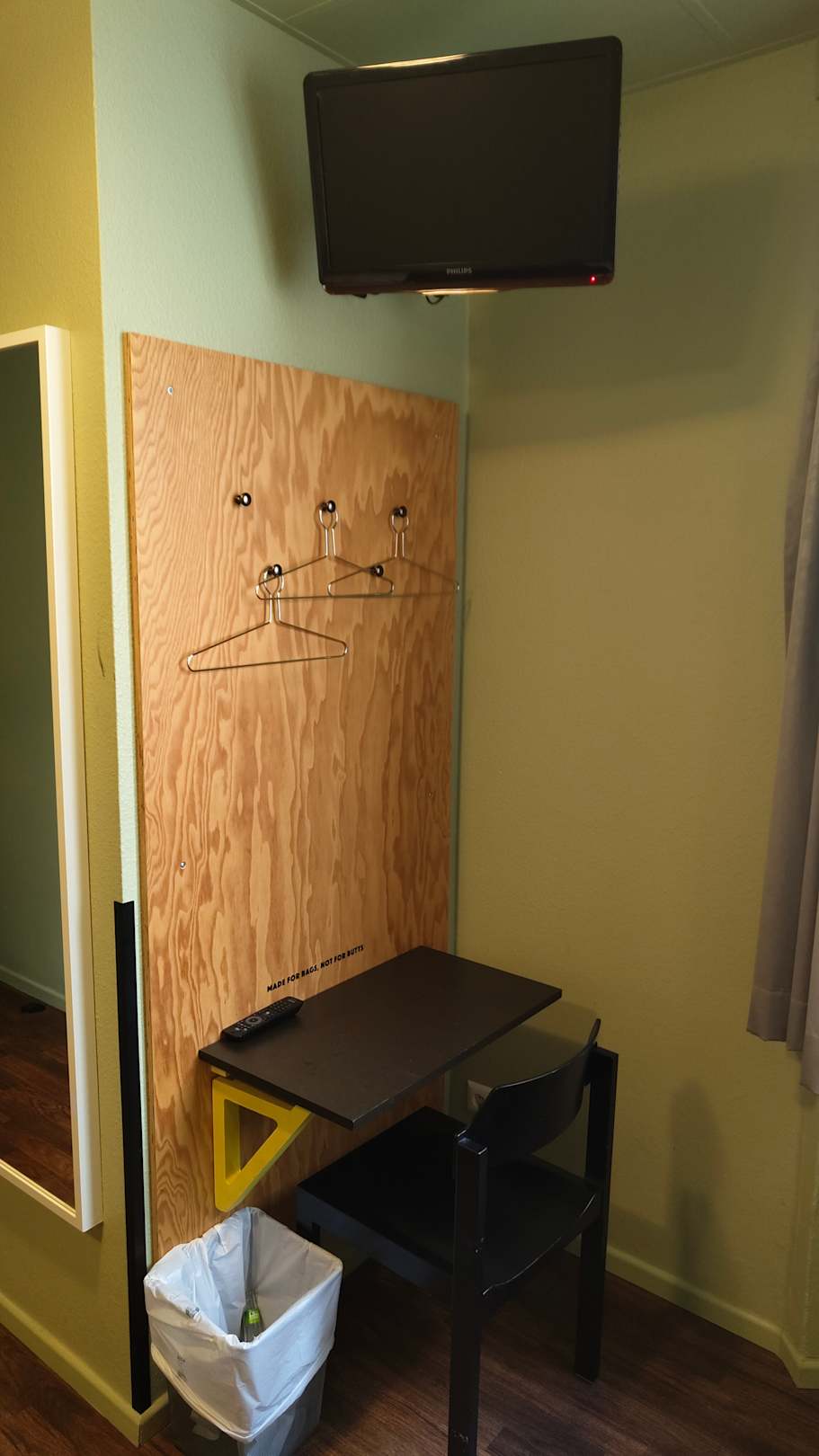 Kleiner Fernseher an der Decke und die Garderobe mit einem kleinen Schreibtisch und Stuhl.