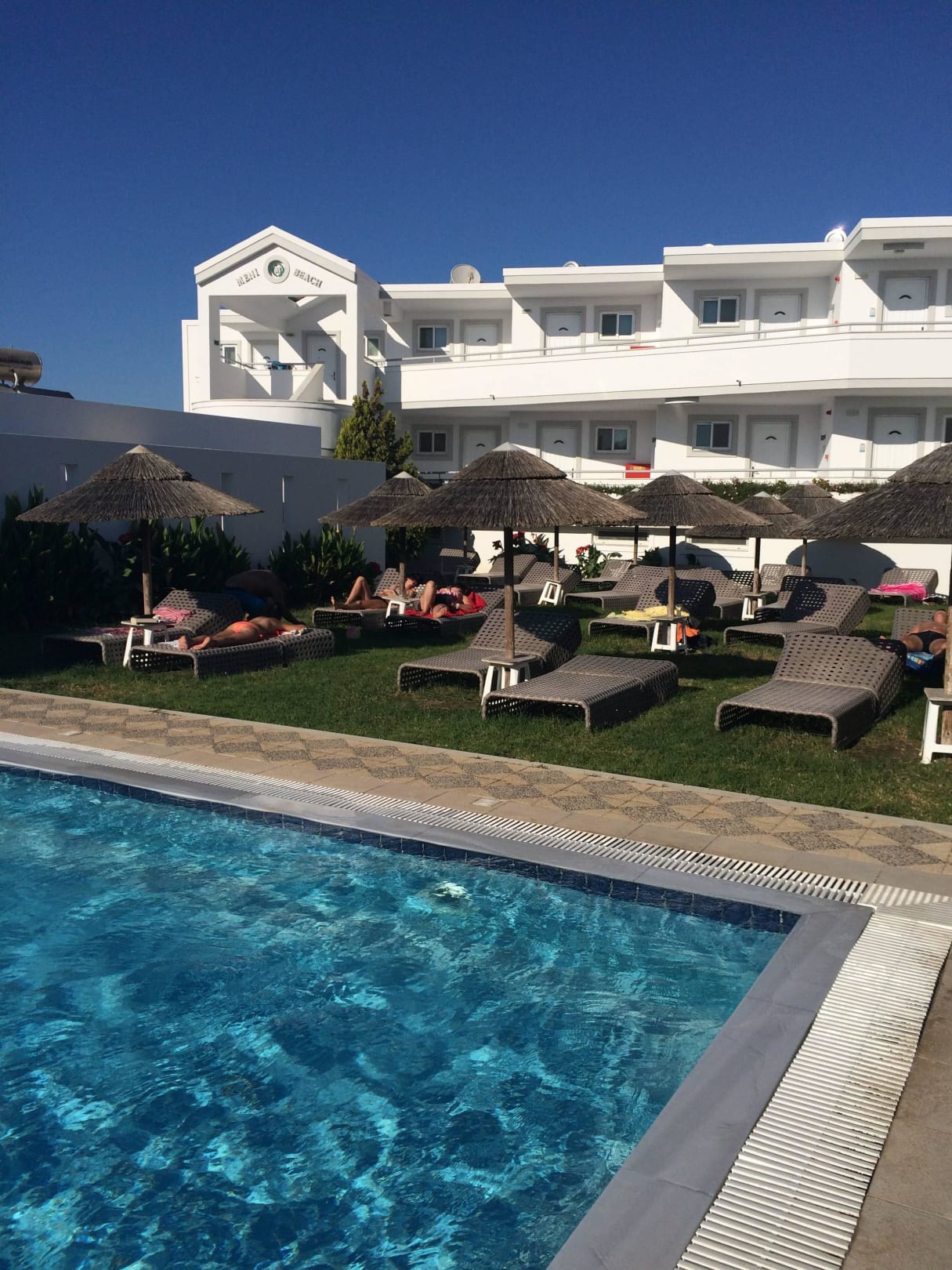 Blick vom Pool zu Zimmern