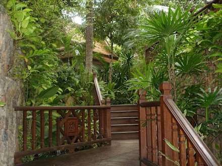 Blick in den GartenVon der Lobby führt eine Treppe zu den Cottages.