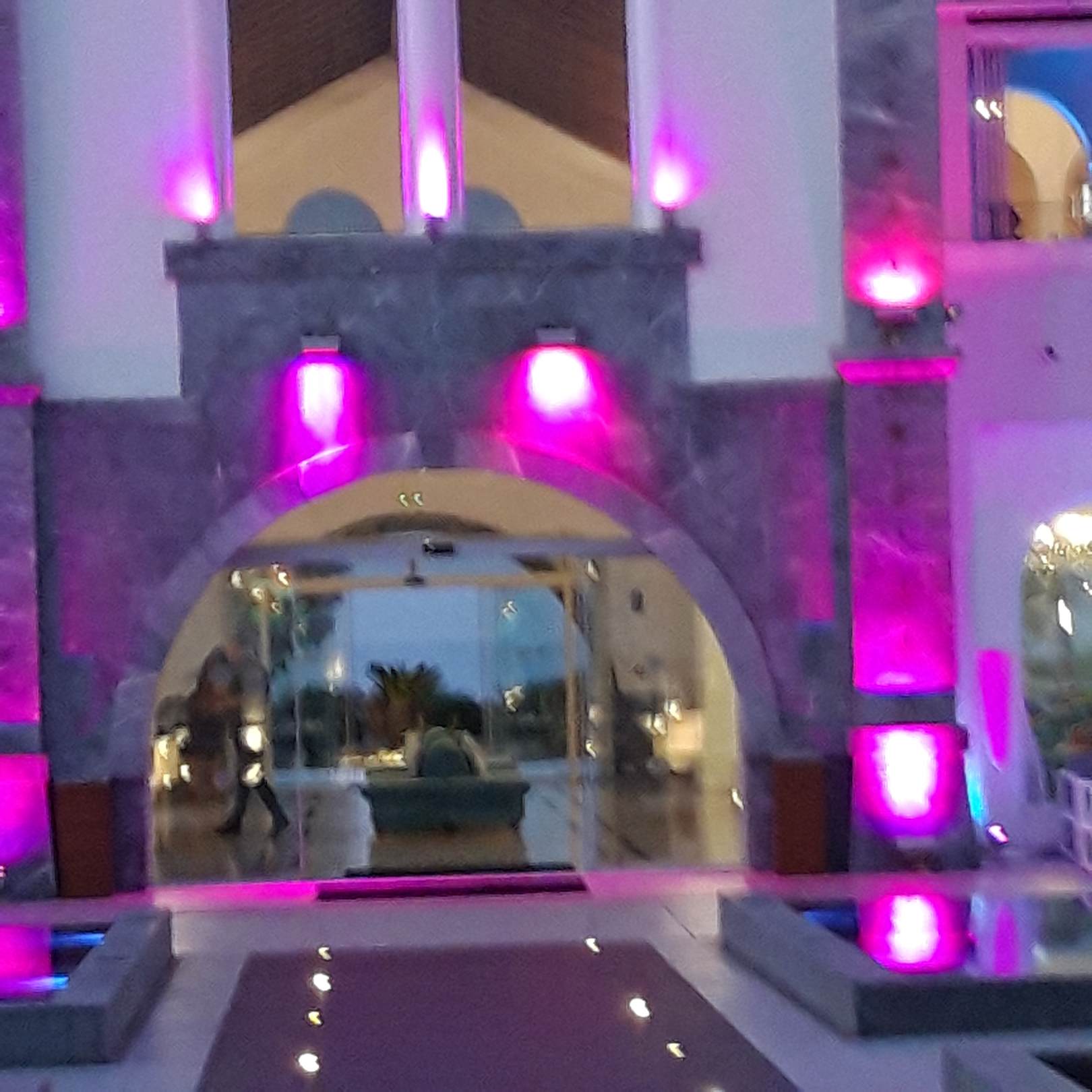 Hoteleingang von der Poollandschaft bei Nacht