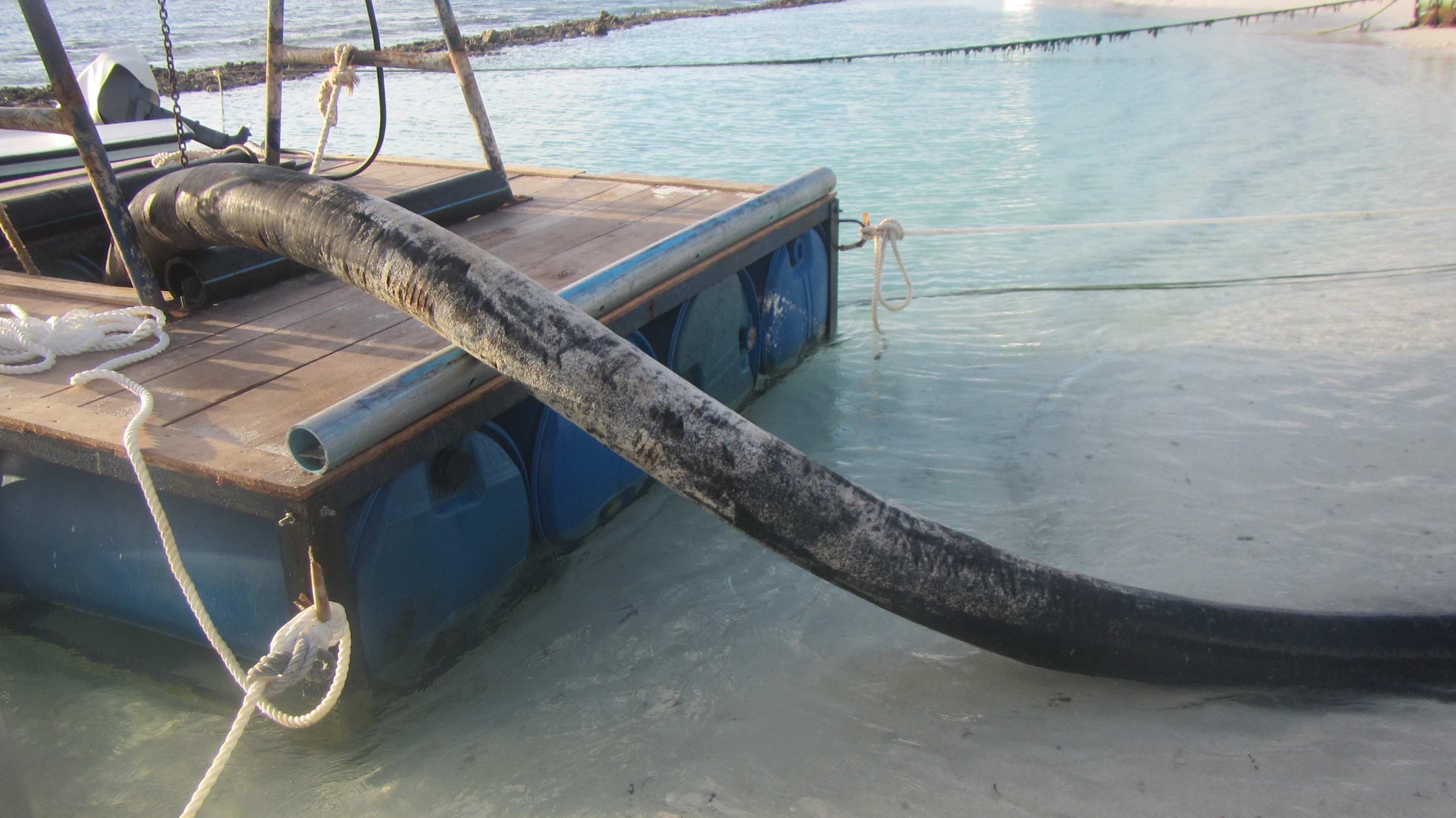 Diese Abpumpmaschinen stehen ständig am puderweisen Strand und pumpen dort am Strand und direkt im Wasser ständig Sand ab und füllen diesen Sand auch zusätzlich in Plastiksandsäcke. Das Waser in Strandnähe ist deshalb trüb.