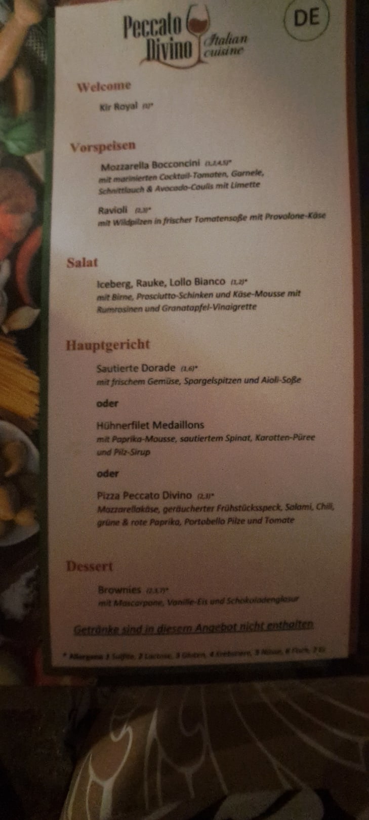 Speisekarte italienisches a la carte