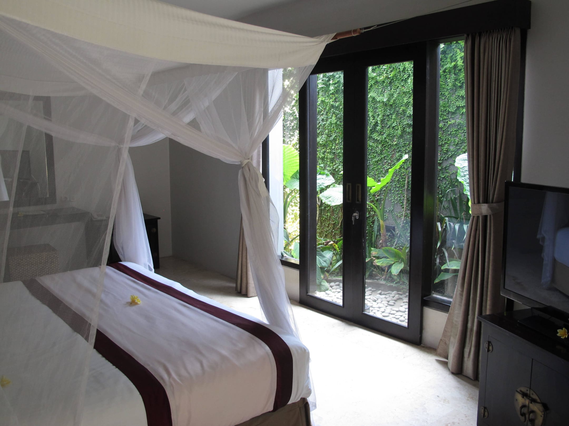 Blick vom Eingang über's Bett zum Lichthof und rechts der grosse Flatscreen-TV (mit der in der Kommode verborgenem DVD-Player). Über die Sender kann ich keine Angaben machen, wir haben die Kiste nie angeworfen ...