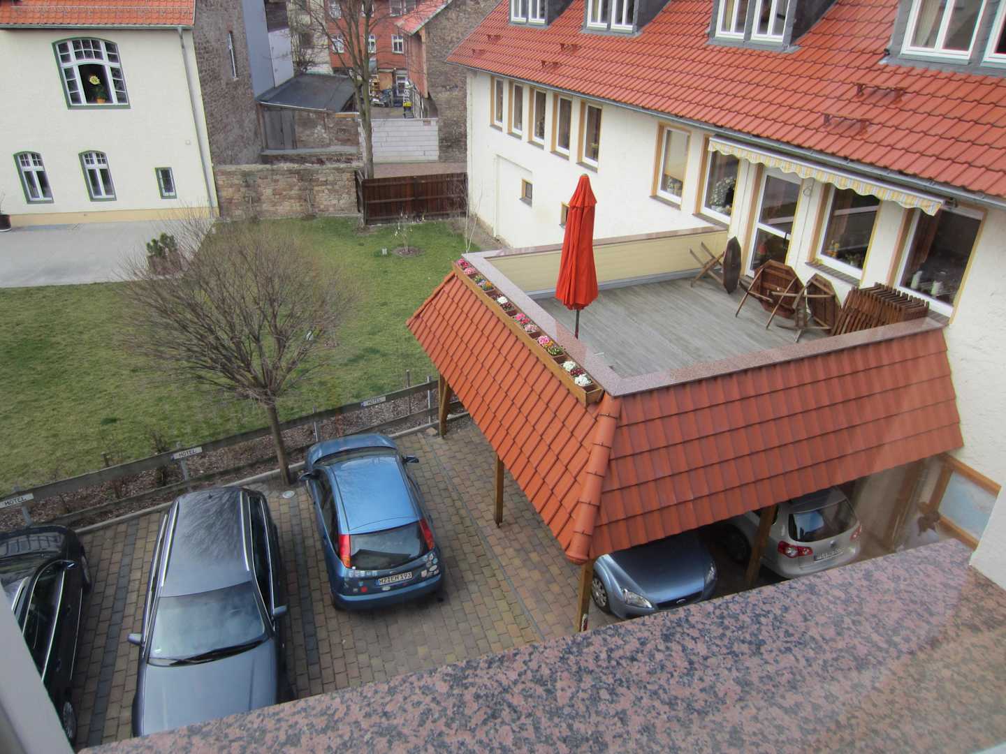 Blick auf die MühlenstubeAusblick aus unserem Zimmer auf die Mühlenstube, dort gibt es das leckere Frühstücksbuffet.