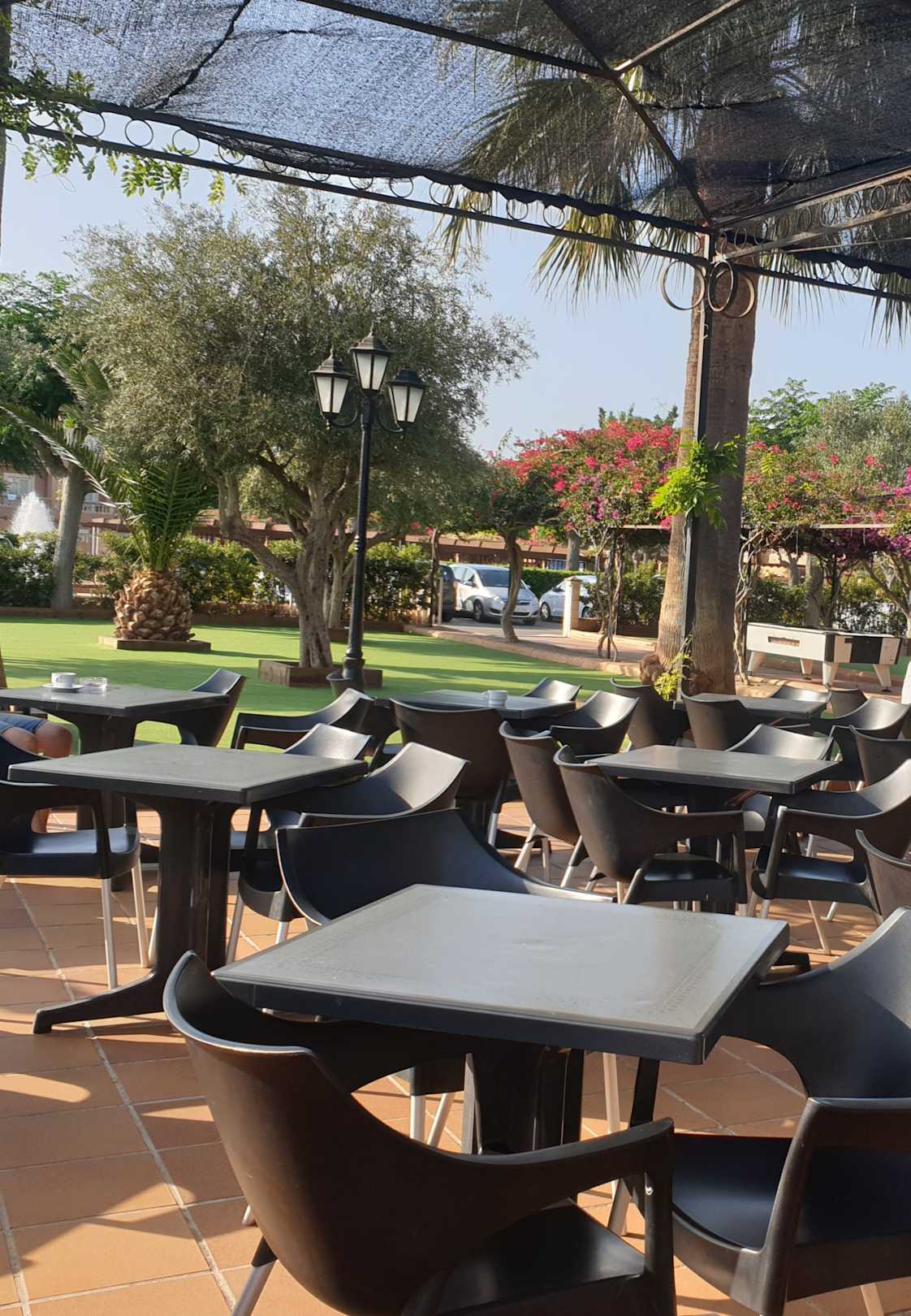 hier kann draußen gegessen werden oder abends das Programm gesehen werden - im Hintergrund auf dem Platz können die Kinder toben und man hat sie im Auge