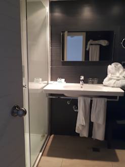 Das Bad, einzig durch zwei zusätzliche Bademäntel wird das Apartement zur Suite - lächerlich.
