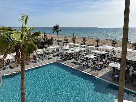 Blick vom Balkon auf den Pool und das Meer