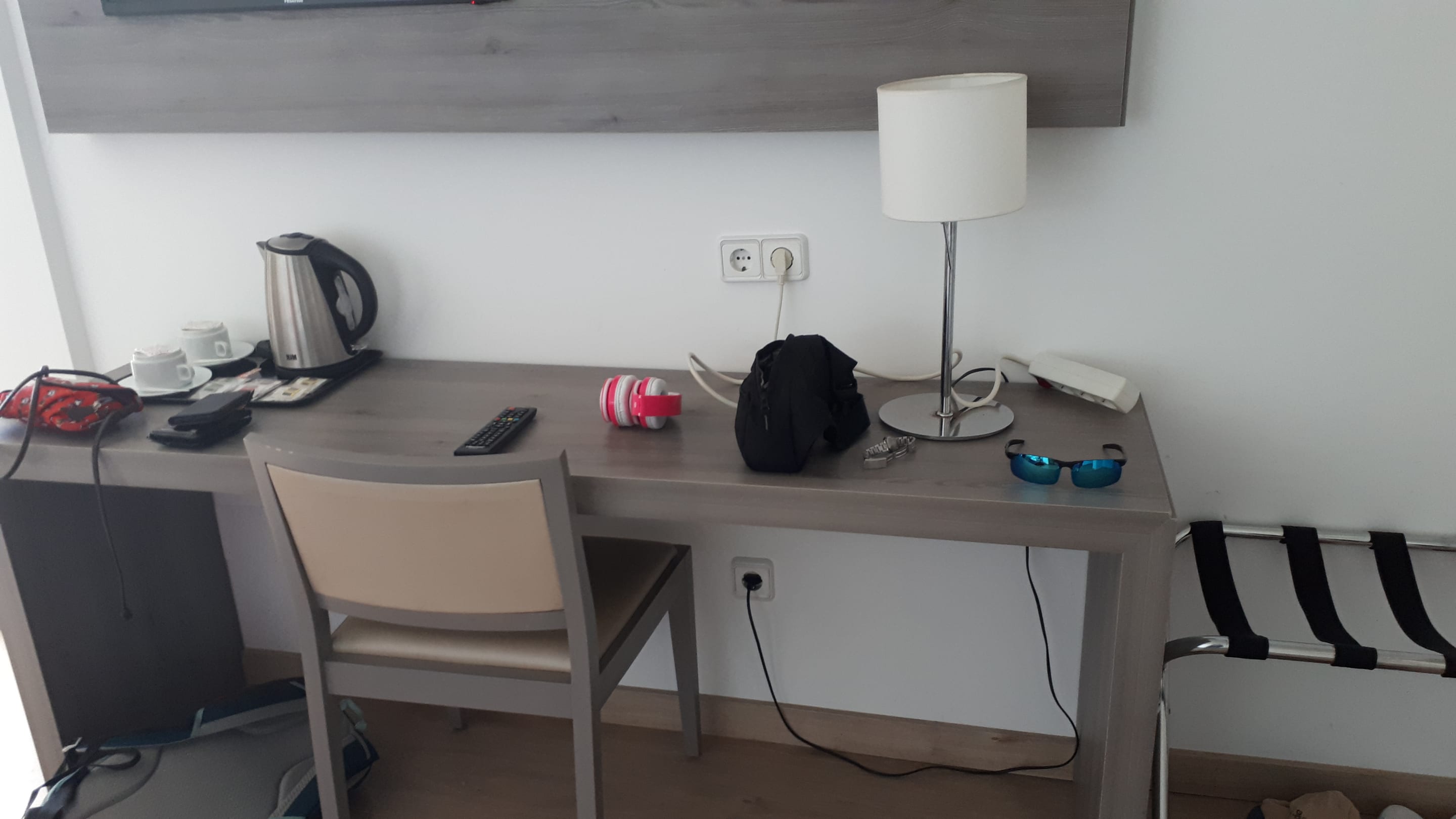 Schreibtisch & Stuhl, Wasserkocher etwas tricky, aber mit Übung klappte es, Tee ist da, Tipp: Pulverkaffee & Päckchen Milch kaufen im Laden und Kaffee auch außerhalb der Barzeiten genießen, darüber TV, links Balkonzugang, rechts Kühlschrank