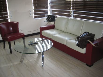 Couch, Stereoanlage mit ipod-dockingstation und kleinem Tisch