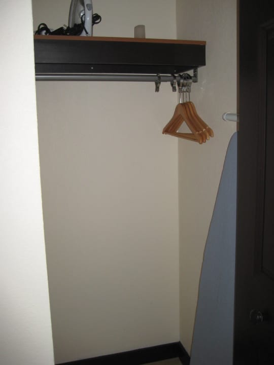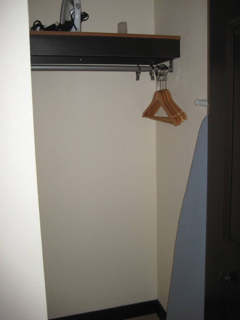 je nach Zimmertyp 1-2 mal vorhanden mit 5 Bügeln, Bügelbrett, Bügeleisen und Föhn