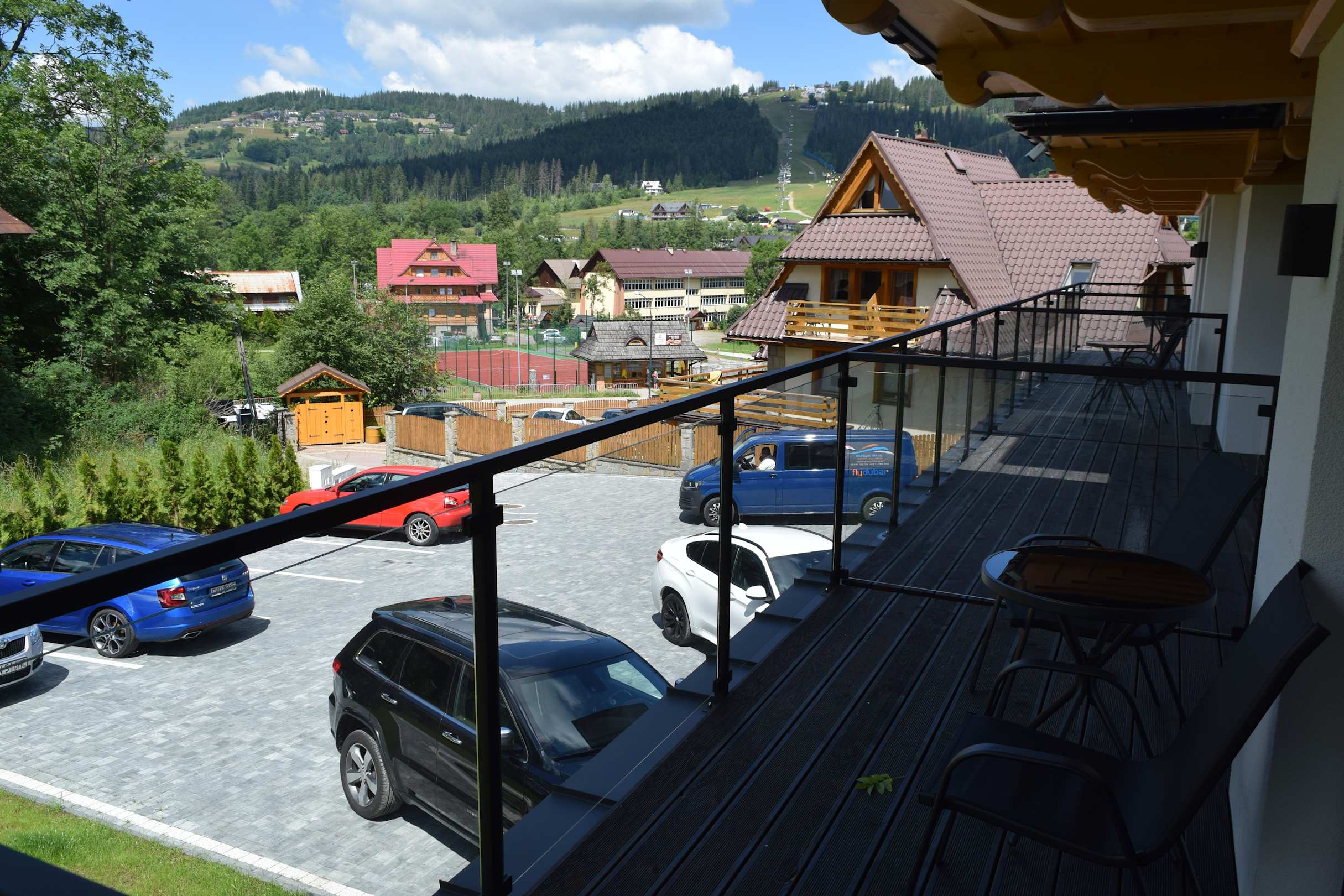 Blick vom Balkon auf den Parkplatz