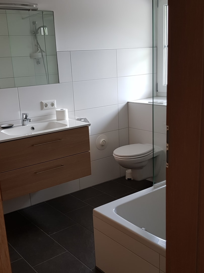 Badezimmer mit Wanne und Waschmaschine, Infrarotkabine