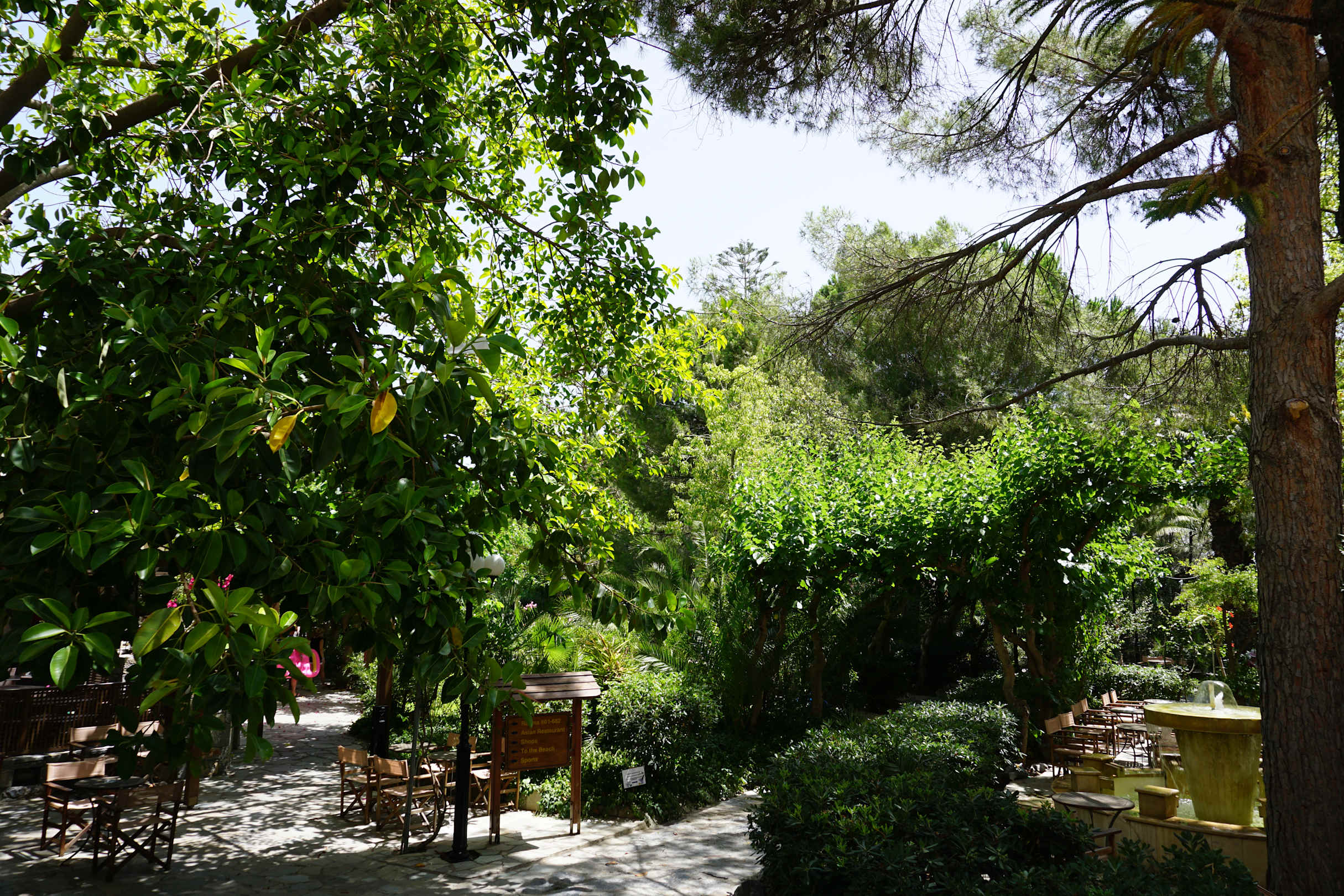 Blick von der Lobby-Bar zum Hauptweg in Richtung Bungalow-Zimmer, Pools, Strand und teilweise rechts zum Garten. In der Lobby-Bar (Außenfläche) gibt es einen schönen Springbrunnen, der Abends beleuchtet ist.