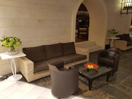 LobbySitzgruppe gegenüber der Rezeption. Alle Sitzgruppen sind mit zusätzlichen Stromanschlüssen (für z.Bsp. Handys) ausgestattet.