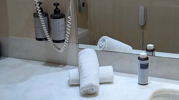 Typische Badausstattung mit Handtüchern und Reinigungsflüssigkeiten.