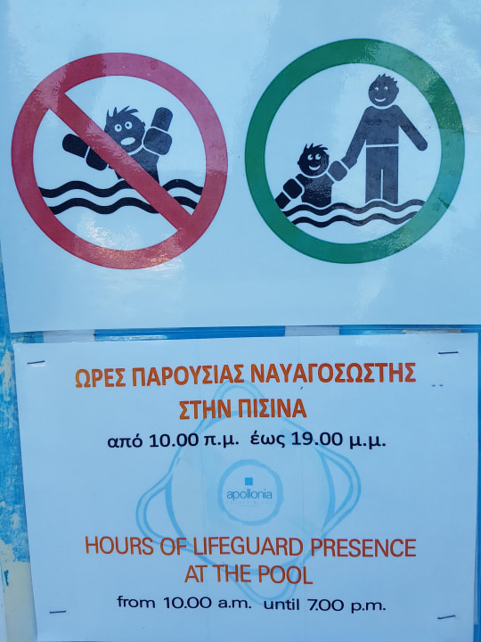 Warnschild am Kinderpool und Information über die Zeiten des Rettungsschwimmer.