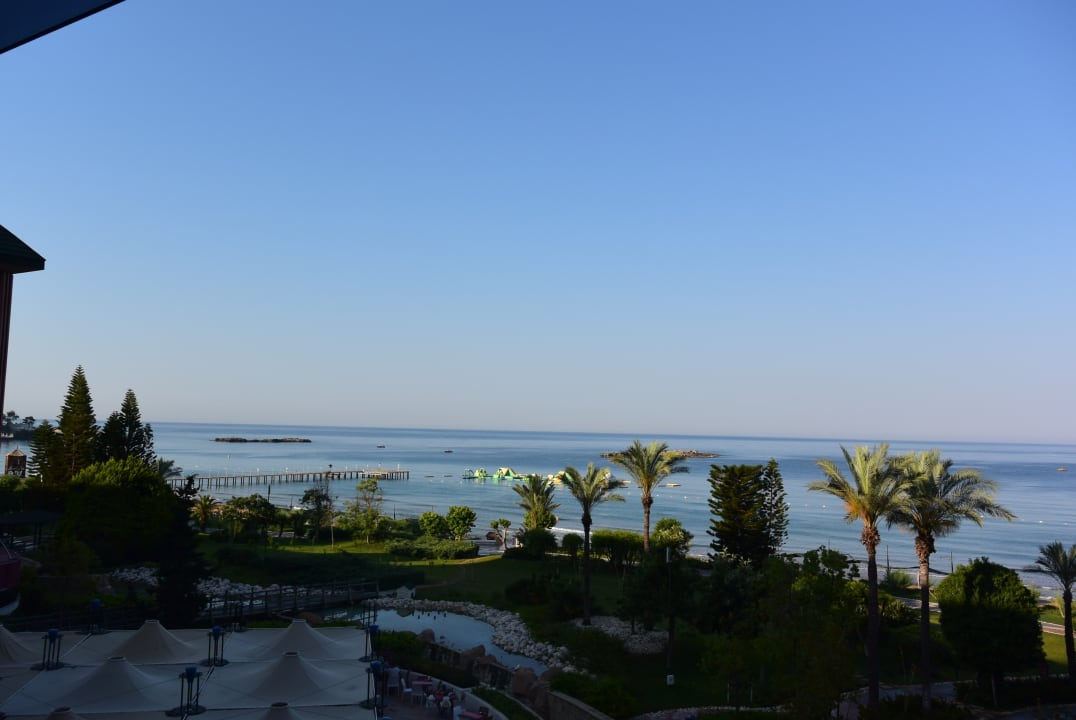 Ausblick vom Familienzimmer auf das Meer mit Steg und Wasserpark.