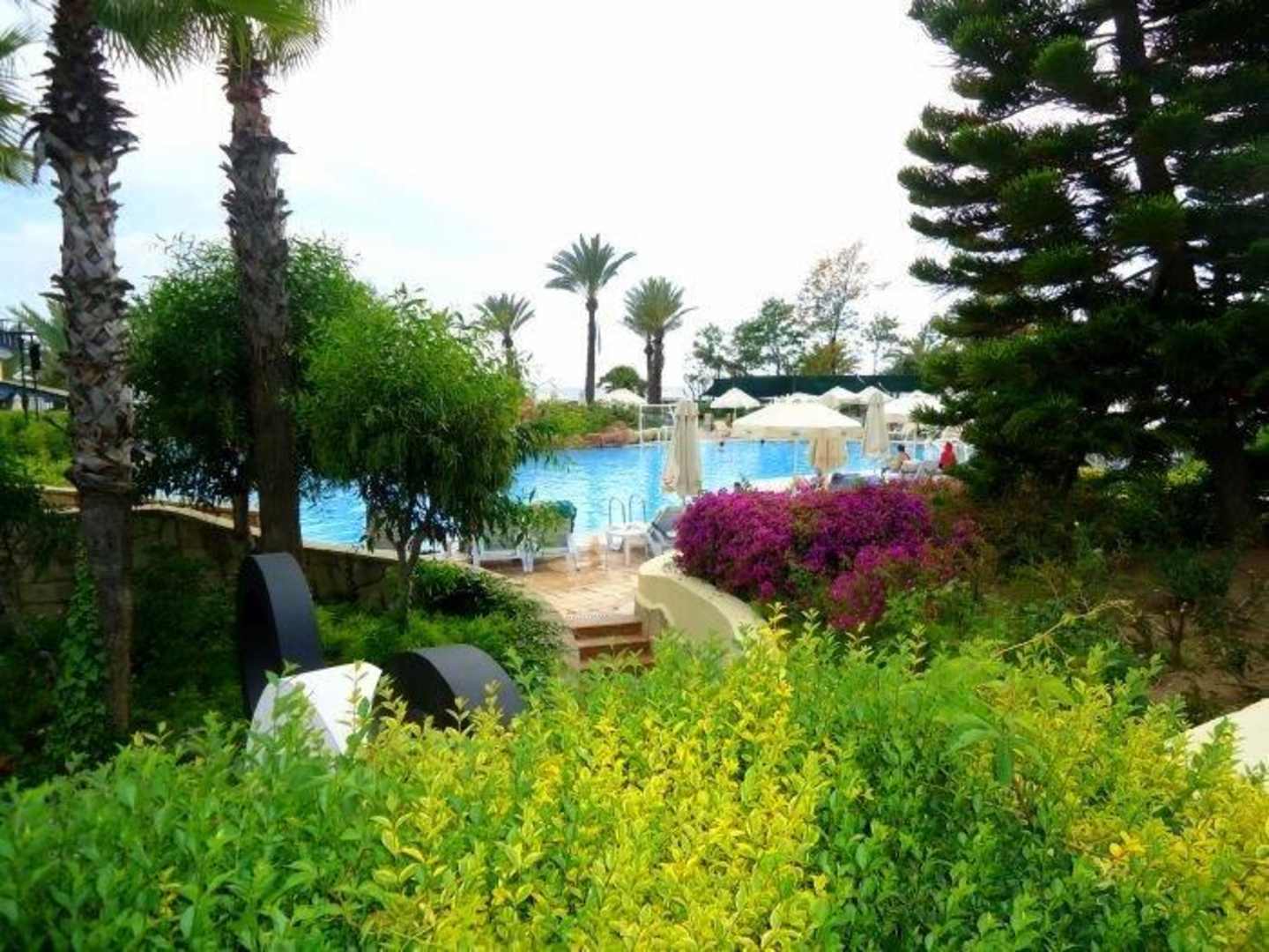 Widok z ogrodu na hotelowy basen.