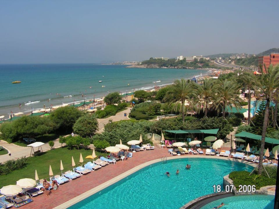 Fotografiert aus der 2. Etage - Blick auf den kleinen Pool vorm Hallenbad - im Hintergrund der Hoteleigene Strand und Teile der Bucht von Incekum.