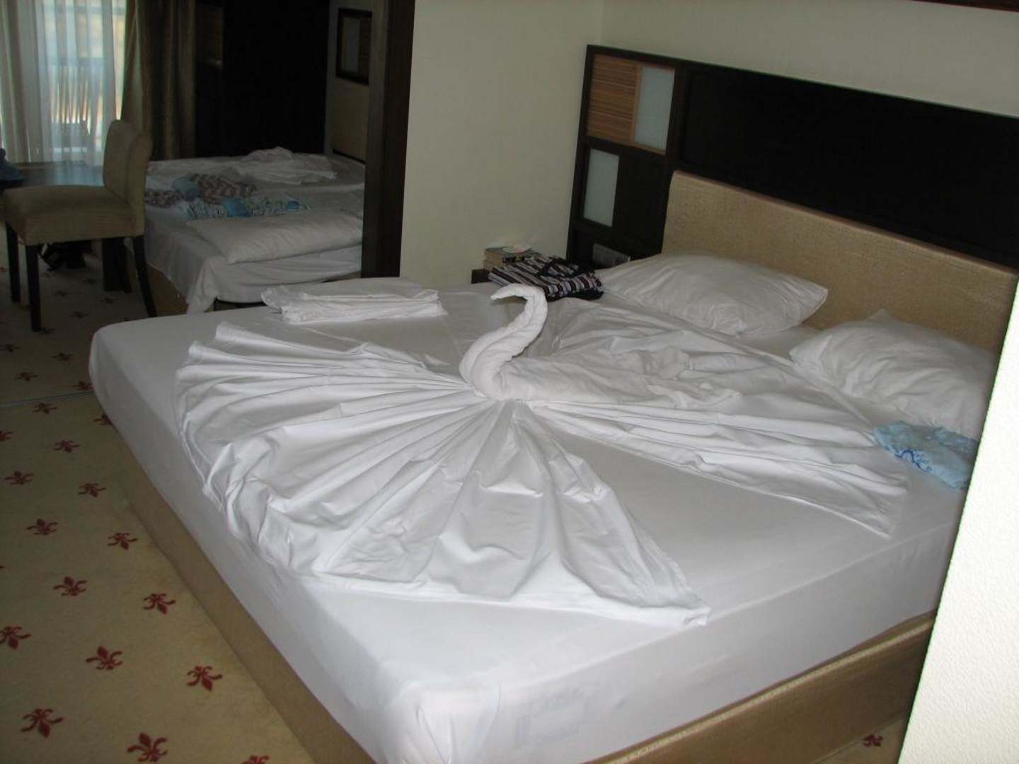 Blick ins Familienzimmer mit schön gestaltetem Bett, im Hintergrund das Kinderbett