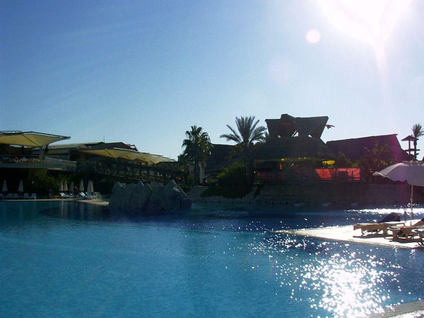 Blick vom Poolrand Richtung Poolbar und Brücke zum Restaurant.