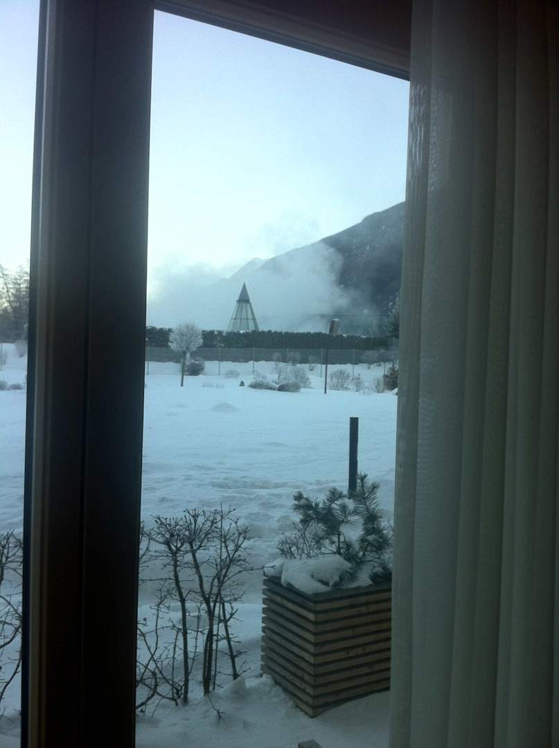 Blick vom Zimmer in den Garten mit Bad