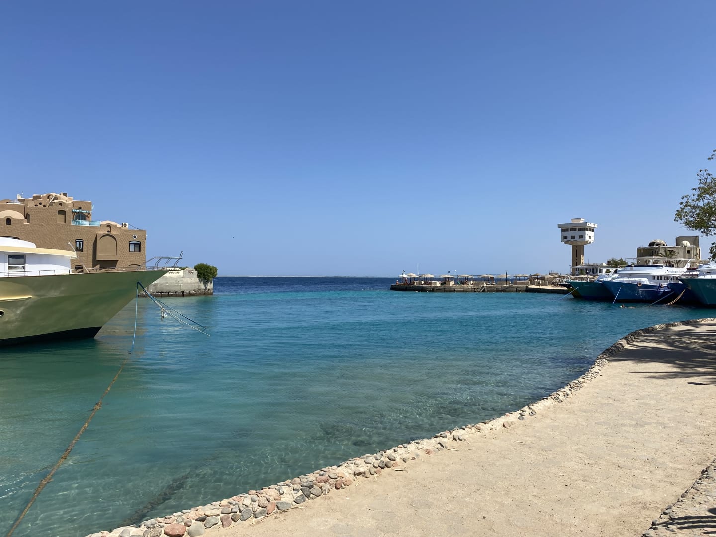 Blick auf den Hafen im Hotel Hier liegen die Boote der Tauchbasis und des Aquacenters.